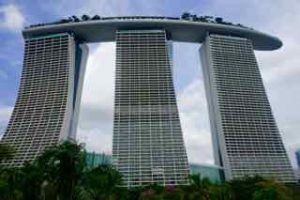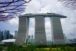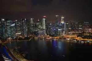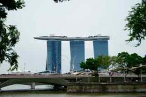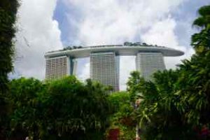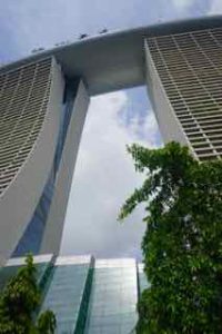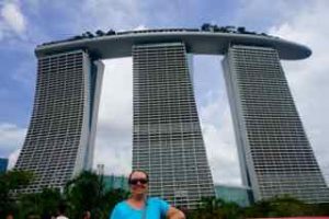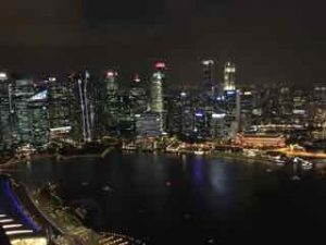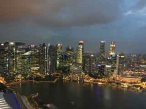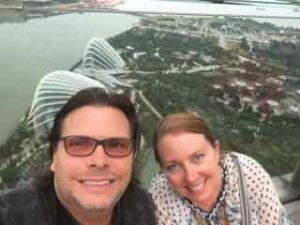 After our morning at the Botanic Garden, the weather continues to be great. We have been trying to plan our trip to Marina Sands park observation deck on a more sunny day. However, we really haven’t had any sunny days and none are forecast through mid next week. So we decide to go near sunset to the perch on the 56th floor of the Marina Bay Sands. Marina Bay Sands consists of three 55 story towers that house over 2,500 hotel rooms. Sitting on top and across the three towers is a 1,120 foot SkyPark, restaurant, observation deck and a 490 ft infinity edge swimming pool. From a distance it looks a bit like a large surf board stretched across these three towers. It is considered the world’s largest public cantilevered platform, which overhangs the north tower by 220 feet.