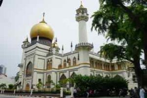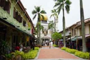 We stroll around the area including the beautiful mosque, known as Masjid Sultan The mosque was originally built in 1824, rebuilt in 1932. Each dome base is decorated with glass bottle ends, donated by the poor during its construction so that all could contribute.