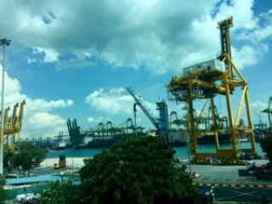 Our timing allows us to capture a few daylight pictures, not great because of the clouds. But there are still great views of the city and the hundreds of ships waiting to move into the Singapore port. An amazing scene.