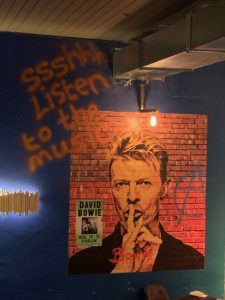 The place is great if you want to “listen” to the music…note the picture on the wall of David Bowie… ‘Shhhh, let’s listen to the music…’ The pizza’s aren’t bad either!