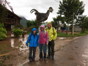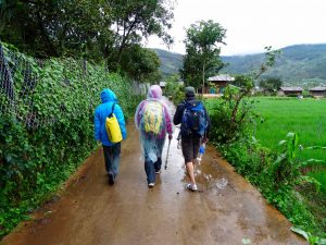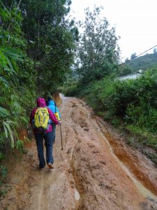 We pass by many workers in the fields, some wondering why we are hiking in the rain. At one point we pass by some workers cutting flowers for shipping. We help load them on the motorcycle in exchange for some pictures. Interesting supply chain. I wonder what country these flowers are going to!