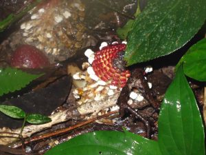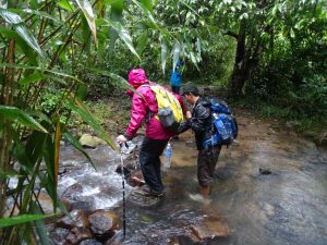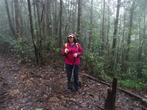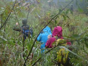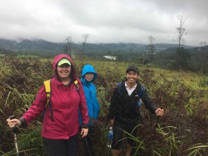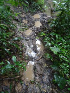 We made it to the crest of Elephant Mountain around 12:30pm and stop to eat some local bananas for energy…in the pouring rain. It starts to rain a bit harder so we start moving back into the more dense jungle to try to avoid some of the water.