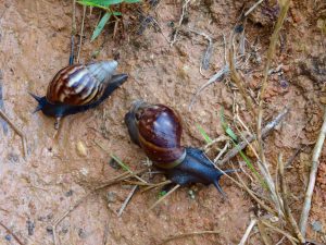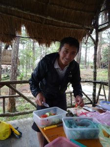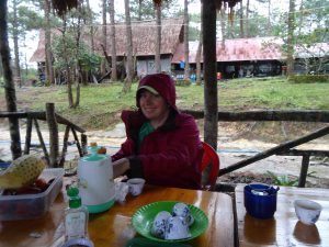 We head down the backside of the mountain. Tracey and Carol slip several times on the wet, muddy trail. At one point we spot a green snake on the trail…a viper! It wasn’t very reassuring that our guide was scrambling away as quickly as he could, when we announced we saw a snake! Vien and Carol must have nearly stepped on it because it was quite active when Tracey walked by it. Anyway, we count ourselves lucky since we are far away from any medical attention, were it to be necessary.