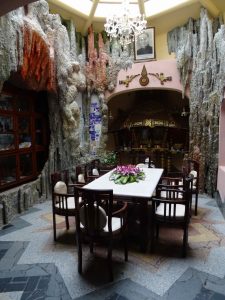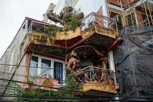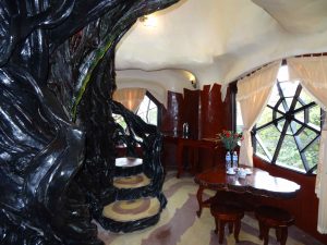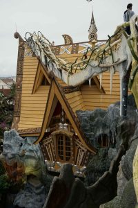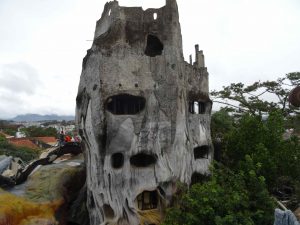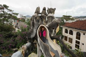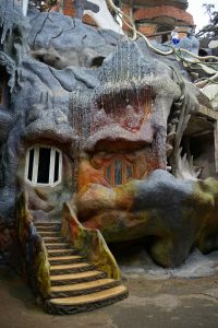 It continues to rain, lighter but steady. We walk through the town and over to a place known as the “Crazy House“. The house is designed by the Vietnamese architect Đặng Việt Nga. It has an architectural style seeming to incorporate Gaudi, Disney and Dali. Like Gaudi and Dali, its designs are influenced by nature: plants and animals.
