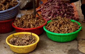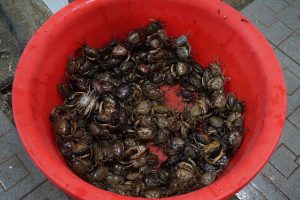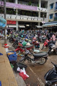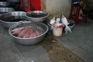 We venture through the Dalat City center and the markets. They are actually quite remarkable lining the streets, but are also housed in a several story structure. The first floor has all kinds of fresh meat, poultry, fish, crabs and other shellfish, worms?, eel?, and other unknown items. The upper floors have packaged foods, clothes, shoes, and jewelry. I do not see too many shoe sizes or clothes that would fit me here.