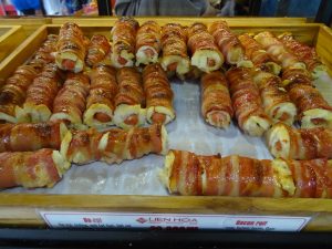 We head across the river from our hotel to the town center. Apparently, the town is known for its bakeries. We hit the Ho Lein Bakery. It is fabulous. It is like a grocery store with all fresh-baked goods from pastries to bun to “pigs in a blanket”. We select a few samples and head upstairs to sit and to pair the food with some coffee. The town of Dalat also has a coffee shop or two on each block. There seems to be a big coffee culture here with youngsters glued to their phones sipping coffee at these places.