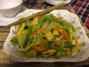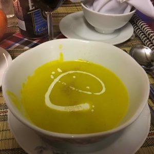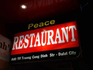 As night falls the view from our hotel room of the lights of Dalat City are beautiful. We venture out to dinner at TeAnh Peace Cafe. The food is excellent, maybe the best pumpkin soup I have ever had. The owner TeAnh is energetic and talkative, very welcoming! I tried a glass of red Dalat wine. The grapes are not grown here, but the wine is made in Dalat. Not fantastic, but not bad. Inexpensive, of course.