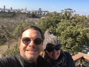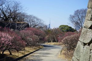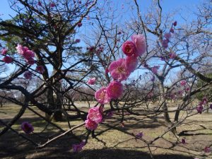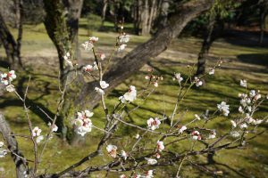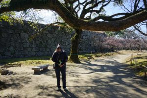 Much of the area has been turned into a park. Even though it is winter, there is a fair amount of “green”. There is a very large cherry and plum orchard that has actually started to bloom. Many people are out photographing and one photographer wants to take our picture. She hurriedly sets up her tripod. There are not many westerners here as we have only seen a handful of non Asians the last couple days so perhaps we are a bit of a novelty, lol. People working on the grounds are very kind and even seem eager to practice a few words of English with us.