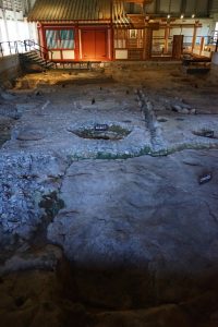 On the grounds once stood a baseball stadium. When the stadium was demolished in 1987, ruins were discovered. The ruins are remnants of the Korokan, an ancient guest house for foreign diplomats used during the Heian period, as far back as the 8th century. This is the only korokan remnant found in all of Japan…amazing.