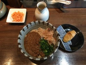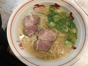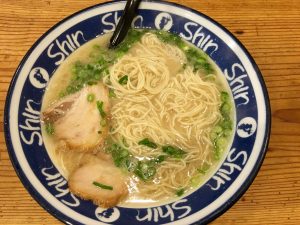 Google Maps guides us to a shop located on a corner, all writing in Japanese. We enter, are warmly greeted with “irasshaimases” and sit at the noodle bar. At least the menu has pictures, lol. It turns out to be ramen noodles, Hakata style. The name of the restaurant is Hokkaido. Hakata ramen is a signature dish initially from the Hakata region, it a staple and delicacy in Fukuoka. It is a white, thick soup that is made from pork bones, with thinner ramen noodles, and toppings of cha-shu, chopped scallions, ginger, and sesame seeds. The miso type broth has a little bit of a spicy kick to it. Delicious!
