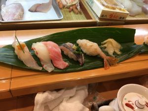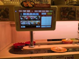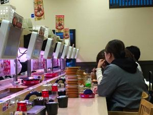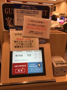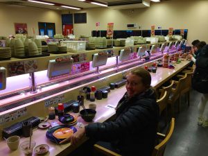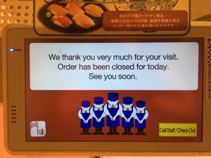 We head back to the apartment for a brief siesta before heading out for sushi. Just around the corner we found Sushiro, a conveyor belt type sushi bar. There is about a twenty-minute wait. The queue is tracked automatically once you enter your seat request in the “machine”. Problem, the machine is all in Japanese letters. I take a guess. I check later and am told I requested a table and not a seat at the counter, but they kindly adjusted. While waiting, I offer my seat to a young teenager and her mother, they insist that I remain seated. They bowed to me for my offer and when they were leaving to be seated they bowed to me again. What kindness and respect! Or maybe I am just looking old.