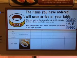 Once seated at the counter, there is a hot water tap for making your own green tea. We can select items off the conveyor belt or order from the touchscreen. When ready the custom ordered food comes around on the conveyor belt and the screen in front of us alerts us that our order is approaching…awesome. We order plenty of sushi as well as tempura ebi udon. This meal would have cost us over $100 at Yume in Sarasota…here, $26!