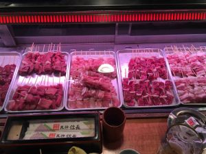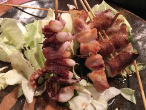 We stay pretty safe here food wise, not ordering anything too crazy. We sample beef loin, chicken thighs, squid tentacles, shrimp, sweet potato, shiitake mushrooms, and bacon wrapped asparagus. The food is all excellent!