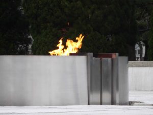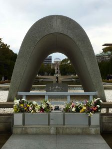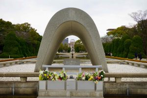 Near the center of the park is the cenotaph, concrete, saddle-shaped monument that holds the names of all of the people killed. The monument is aligned with the Peace Flame and the A-Bomb Dome. The Peace Flame has been burning since August 1st, 1964 and is not to be extinguished until nuclear weapons are eliminated. The arch represents a shelter for the souls of the victims.