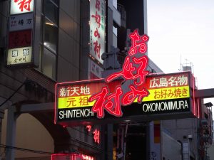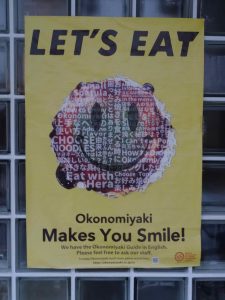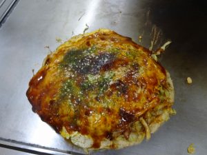 We find a great spot for the famous Hiroshima okonomiyaki. It is a dish similar to teppanyaki but instead comes in layers. The foundation is a thin pancake on which soba noodles, cabbage, egg, and other ingredients of choice are stacked on top of each other. My dish includes squid and delicious okonomiyaki sauce!