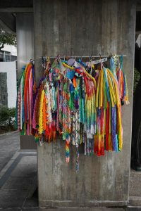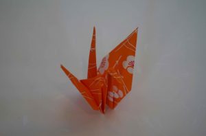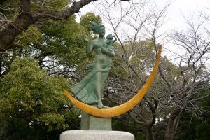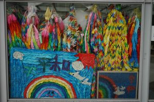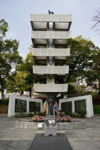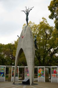 The Peace Park also includes the Children’s Peace Monument. The monument was inspired by Sadako Sasaki, who was two years old at the time of the atomic bombing. Sadako developed leukaemia at 11 years old and decided to fold 1000 paper cranes. The crane is the symbol of longevity and happiness in Japan and she believed if she made the 1000 cranes she would recover. She died before she made all the cranes, but her classmates folded the rest. Her story inspired the symbolic paper-crane folding that continues to this day. We see the many thousands of colorful folded cranes.