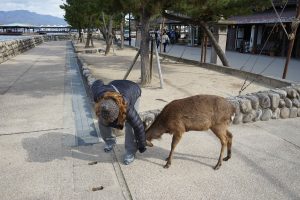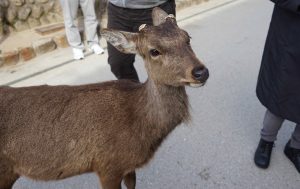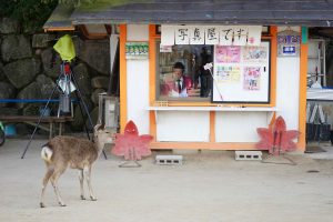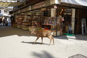 We also walk through the small town surrounding the shrines. There are many shops, especially food! Even the deer are surmising the options here.