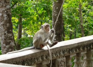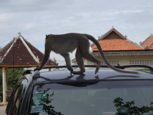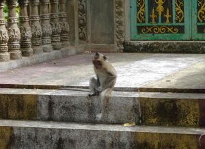 Our next stop is Kompong Cham where we arrive a bit later in the morning and visit the sacred hills of Phnom Pros and Phnom Srei. The monkeys are the entertainment here. Snacks are sold here, bananas for the monkeys. The monkeys seem to know the tourists, as we are approached. They like our SUV. When our driver tries to get the monkey off the car, the monkey has none of it. He starts to go toward the driver and bears teeth. All the driver had to do is “show” a slingshot and the monkey backs off!
