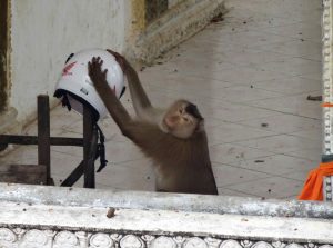 Another monkey is very interested in a cycle helmet. I think he is trying to figure out how to put it on. Either that or he wants to go for a ride. Smart creatures!