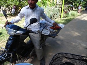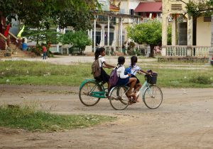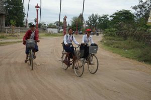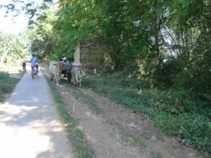 The path is sometimes concrete but often dirt and narrow in spots. The bikes are old and not well-balanced, so it makes it challenging when passing the occasional motorbike. The motorbikes are often loaded with some type of cargo as just about anything and everything is transported by this method.
