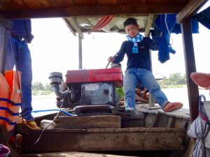 We embark on our journey by walking down 100 steps to the Mekong, where we board the local ferry. The ferry is a small wooden boat, with what looks like a car engine that is used to motor us across the Mekong to an island in the middle of the river, Koh Trong. As we are sitting cozily next to our mates on the boat, Tracey starts to survey our options for life vests. Three for about 25 passengers. Before we leave, the boat mate drops in about six more vests for good measure. It’s not a long ride, but the currents would sure give you a run for your money if you had to swim.