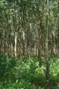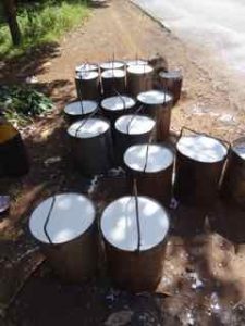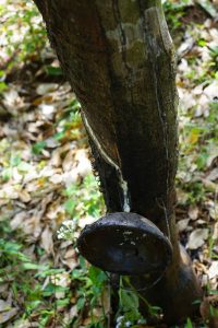 One more stop on the way, a rubber tree plantation. Here the trees are grown that produce the latex. The trees are tapped into, with a small bowl placed underneath. The bowls are collected and buckets then filled. The buckets are then transported to a factory near Phnom Penh for use in tire production.