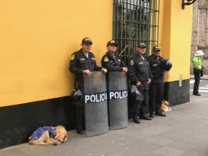 The city is well protected including the presidents quarters and other government buildings. He must be getting ready to leave his residence as it looks like his motorcade is prepping. Lima looks ready for protests! But the police actually do not look too uptight and even pose for a picture with us. The dogs sure liked to hang with them!