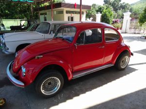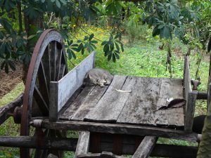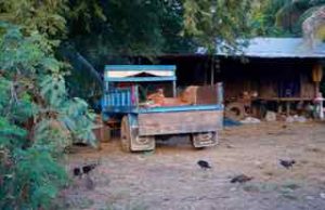 Each car, known as a norry, has a wood frame and platform that is made of bamboo slats. These are covered by a bamboo mat and we have pillows to serve as seats. The cars sit on two axles, the rear one connected to the small gas engine by a fan belt. The cars are also used to transport rice, vegetables and wood.