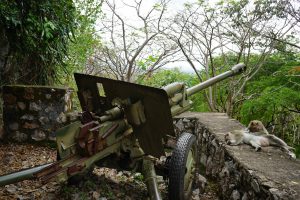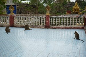 There are no bone collections here, but there are two gun emplacements that were used to help beat back the Khmer Rouge, apparently unsuccessful.. The guns appear to be Russian made. They seem to be used only by the monkeys now.