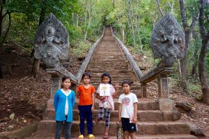 The first stop today is Wat Banan, 22 km outside of Battambang overlooking the Sangkar River. Wat Banan is an ancient temple constructed in the 11th and 12th centuries, apparently taking around 100 years to build. It is nearly 400 steps to ascend the top of the temple area, a descent climb (358 steps to be exact). But it is a rewarding climb with the five towers and numerous carvings still standing albeit in a dilapidated state.