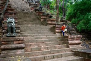The hill is saddle-backed shaped and has temple complexes on both of its peaks. The temple on the slightly lower peak is built over a cave system. These caves involved the absolutely gruesome past of the Khmer Rouge. The temple’s prayer hall was used by them to house prisoners. Their prisoners were the people that they considered educated, rich or that just rubbed them the wrong way.