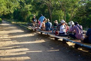 The operation is a single track line. So what happens when our car meets another car traveling in the opposite direction? The brilliant solution for these bamboo trains is simple: one car is quickly disassembled and set on the ground beside the tracks so that the other car can pass. The rule is that the car with the fewest passengers has to cede priority. We always had more cars and people going in our direction, but we did have to stop a few times as we met trains coming toward us.