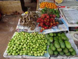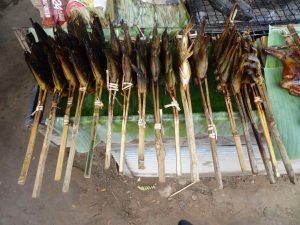 The food is plentiful in the small market areas. There are many types of grilled fish, chicken, frogs and pork that all look delicious.