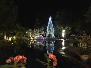 The Resort grows its own fruits and vegetables including banana, mango, jackfruit, dragon fruit and star fruit. Vegetables grown include lemongrass, eggplant, mint, basil and rocket. Our dinner tonight is poolside, still decorated for Christmas! The roast duck and stuffed eggplant are delicious!