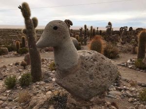 After a bit of wine, food and a few more pics, we drive further into the vastness. Up in the distance we see something on the flats. The closer we get, the larger it gets. We finally come upon Isla Incahuasi, also known as Inca Wasi and Fish Island. It is an “island” among the salt flats. Once covered with water, then an island surrounded by water and now surrounded by salt, it is a hilly, rocky, coral covered outcrop.