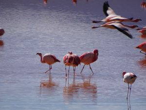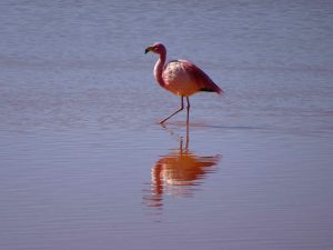 We visit four lagoons or small lakes. Two of them are filled with pink flamingos. Apparently, the high level of minerals in these lagoons can be digested or processed by the flamingos but is dangerous for humans. We are told it is the algae that the gorgeous flamingo consume that produces their pink color.