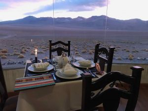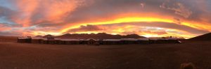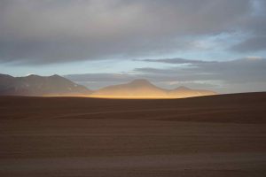 After the last lagoon, we enter a vast desert area with no roads or ways in route to our hotel for the evening. We arrive at the Tayka Desert hotel, 4,500m above sea level (14,663 feet), just in time for a stunning colorful sunset across the plain and mountains.