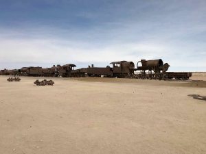 The first stop is the train graveyard, just out-of-town. Trains were used here in the late 1800s through the 1980s in the mining industry. There are still two trains per week on the functional tracks. The town of Uyuni began only because of the train being built in the late 1800s.