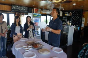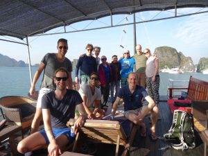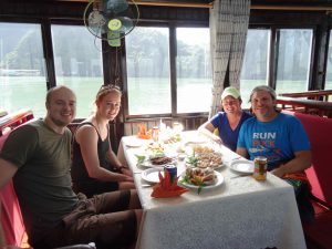 We had a briefing from Hugh the guide on board for the next couple days, a brief intro to the others on the boat, followed by a hearty Vietnamese lunch. Our fellow mates are from the Netherlands, South Africa, Germany and Austria. We later had guests join from Spain, Croatia and Singapore!